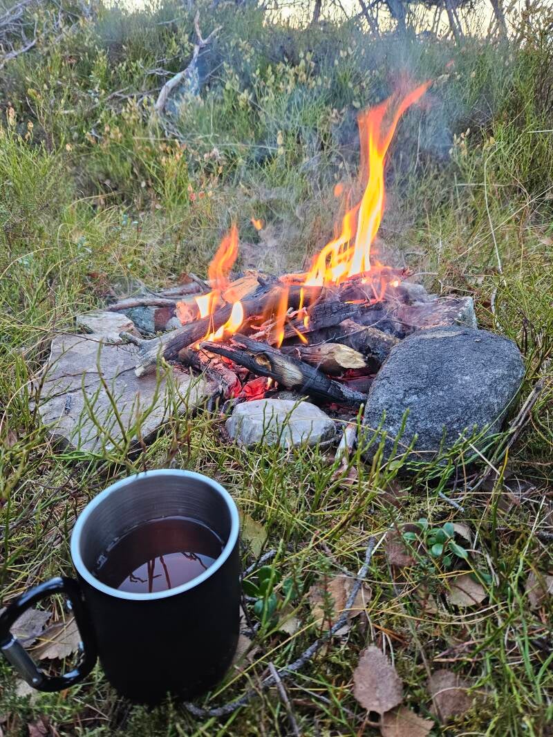 Rond een uurtje of 5 heb ik mijn kampvuur aangestoken en ben ik mijn avondeten gaan maken, waarna het ook al gauw donker begon te worden. De rest van de avond heb ik me bezig gehouden met het drinken van thee, het schrijven in mijn notitieboek en het stoken van het vuur.