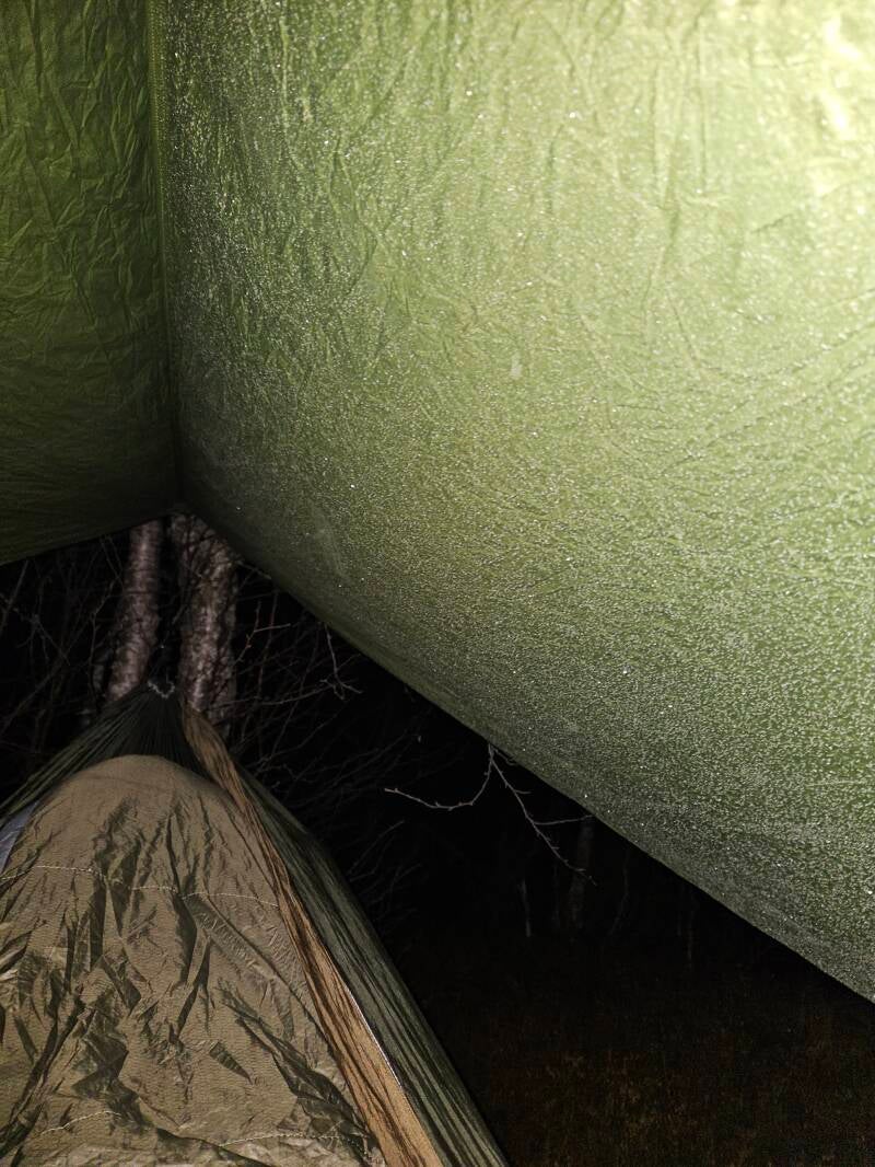 Toen ik later die avond de hangmat in wou gaan kwam ik erachter dat het water in mijn thermosfles bevroren was en dat er ook aan de tarp allemaal ijskristallen zaten. Dit beloofde dus een koude nacht te worden... Dit bleek ook wel te kloppen, aangezien ik in de nacht meerdere keren wakker werd van de kou, maar ook van pijn door de nogal oncomfortabele slaapposities.